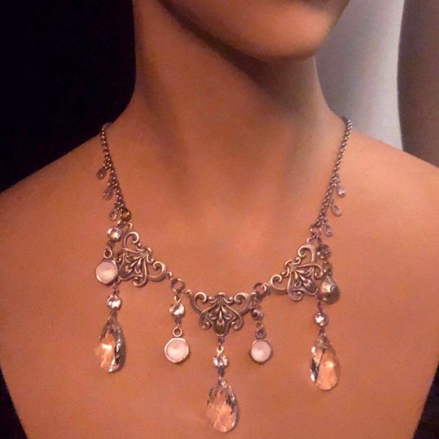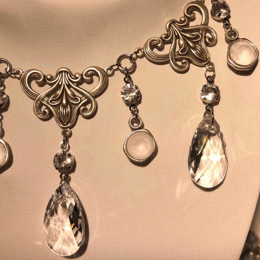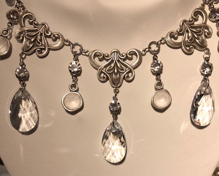 Halsband med kedja i rostfritt stål. Antiksilverfärgade metalldetaljer. 3 st Swarovski Pear-shaped Crystal 22mm, färg Crystal Clear. 4 st Swarovski Chatons 8mm färg: Crystal Matted. Små connectors och små vackra droppar med klar strassten. Längd 45-50c