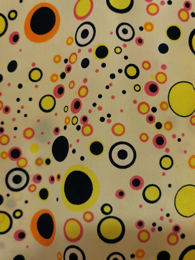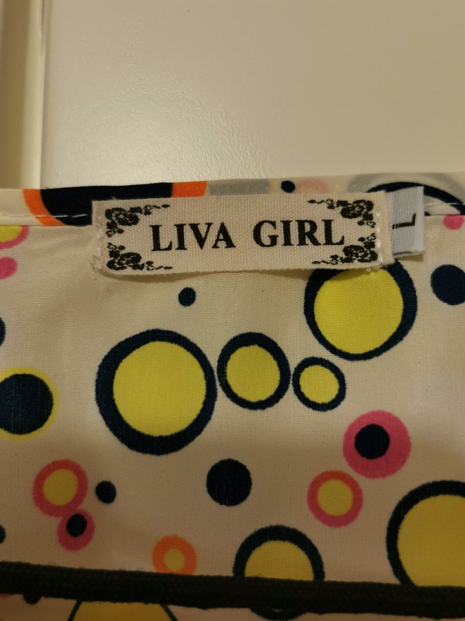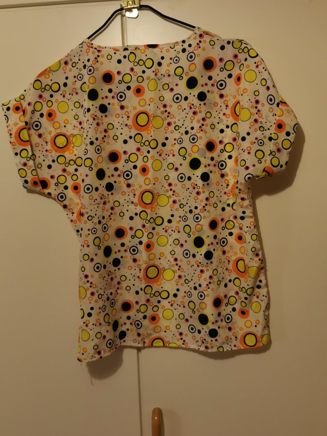 Färgglad blus från Liva Girl med ett unikt prickigt mönster i olika färger som gult, orange, rosa och svart. Blusen har korta ärmar och en rund halsringning.